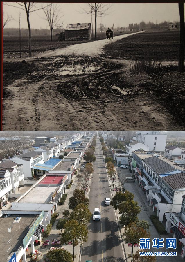 这是一张拼版照片,上图为:曾经的小岗村(资料照片);下图为:现在的小岗村(无人机照片,新华社记者周牧1月30日摄)。新华社发