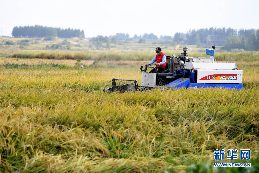 在安徽省滁州市凤阳县小岗村,农民驾驶收割机收割水稻(2018年9月27日摄)。新华社记者 刘军喜 摄
