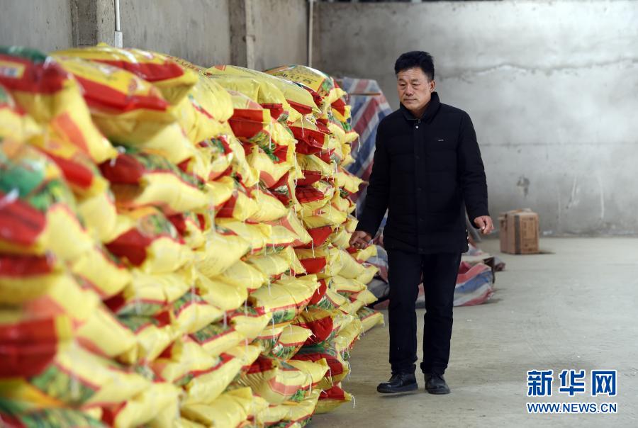 1月30日,在安徽省滁州市凤阳县小岗村,种粮大户程夕兵在查看仓库里的化肥。新华社记者 周牧 摄