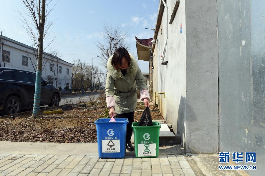 2月3日,在安徽省滁州市凤阳县小岗村,村民王立莉将垃圾分类后投放到家门口的垃圾桶中。新华社记者 周牧 摄