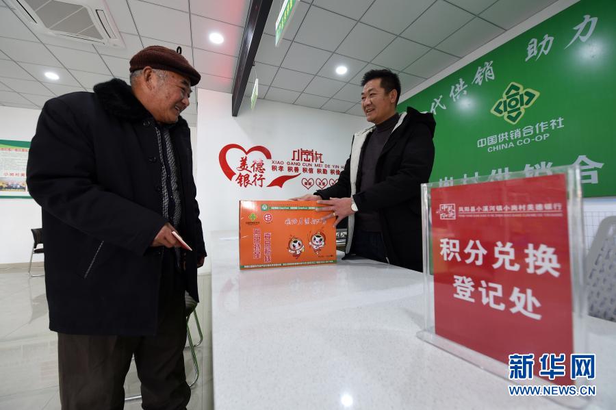 1月30日,在安徽省滁州市凤阳县小岗村,村民缪守鲁(左)在村里“美德银行”用积分兑换生活物品。新华社记者 周牧 摄