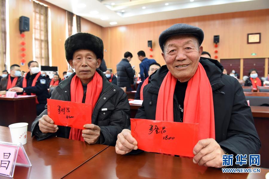 2月3日,在安徽省滁州市凤阳县小岗村,“大包干”带头人严金昌(右)和严付昌展示自家领取的集体经济收益股权分红。新华社记者 周牧 摄