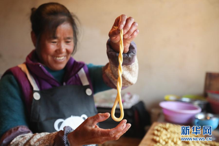 2月6日,在甘肃省定西市渭源县田家河乡元古堆村,曾玉成的妻子陈金娥在家中制作麻花。新华社记者 马希平 摄
