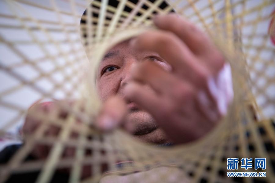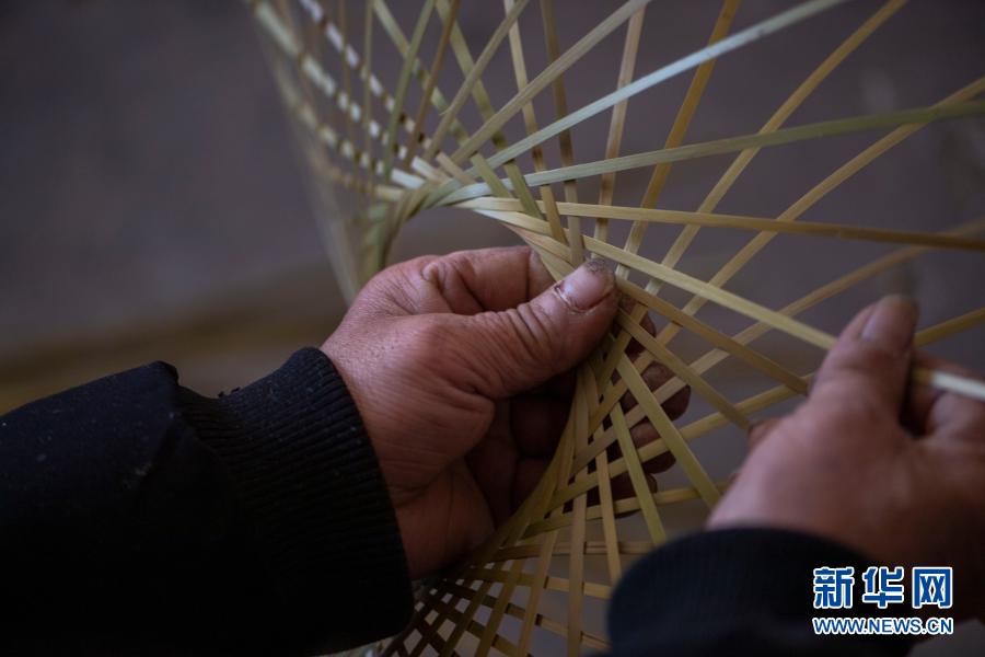 云南省会泽县大一学生王淼的父亲王玉荣在家中编竹编(2月6日)。新华社记者 林碧锋 摄