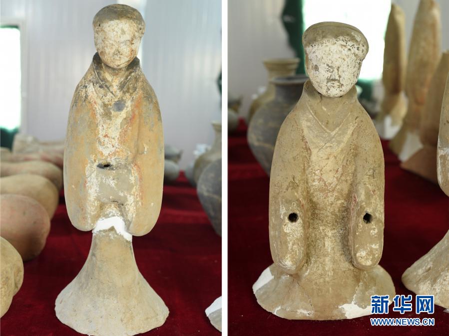 拼版照片:这是黄河孟津会盟段河道内古墓群出土的陶仕女俑(2月23日摄)。新华社发(洛阳市文物考古研究院提供)