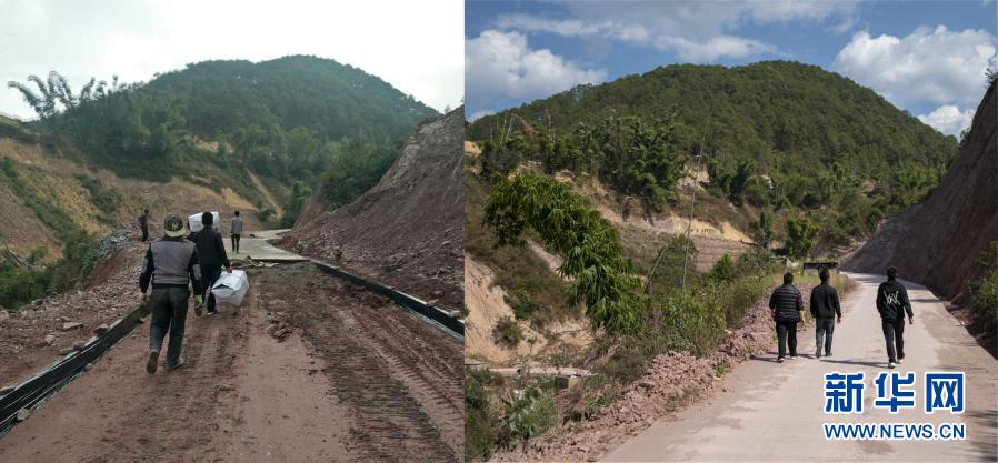 拼版照片:左图为2019年1月拍摄的正在硬化的补干村委会南哈上寨入村道路(吴志宏手机中图片);右图为2021年2月4日拍摄的补干村委会南哈上寨入村道路(新华社记者 陈欣波 摄)。新华社发