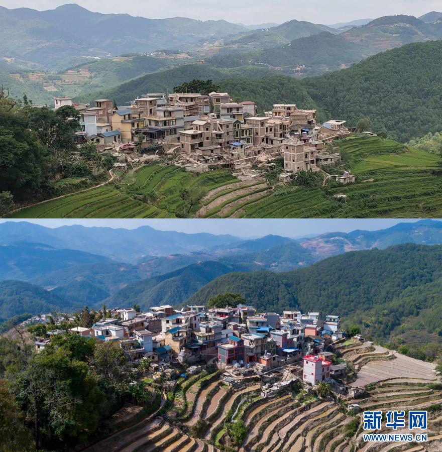 拼版照片,上图为2019年6月拍摄的补干村委会南哈上寨正在改造的村民房屋(吴志宏手机中照片);下图为2021年2月4日拍摄的补干村委会南哈上寨房屋(无人机照片,新华社记者 陈欣波 摄)。新华社发