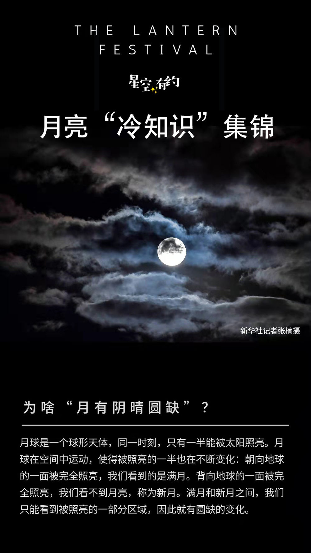 为啥“月有阴晴圆缺”?月球是一个球形天体,同一时刻,只有一半能被太阳照亮。月球在空间中运动,使得被照亮的一半也在不断变化:朝向地球的一面被完全照亮,我们看到的是满月。背向地球的一面被完全照亮,我们看不到月亮,称为新月。满月和新月之间,我们只能看到被照亮的一部分区域,因此就有圆缺的变化。
