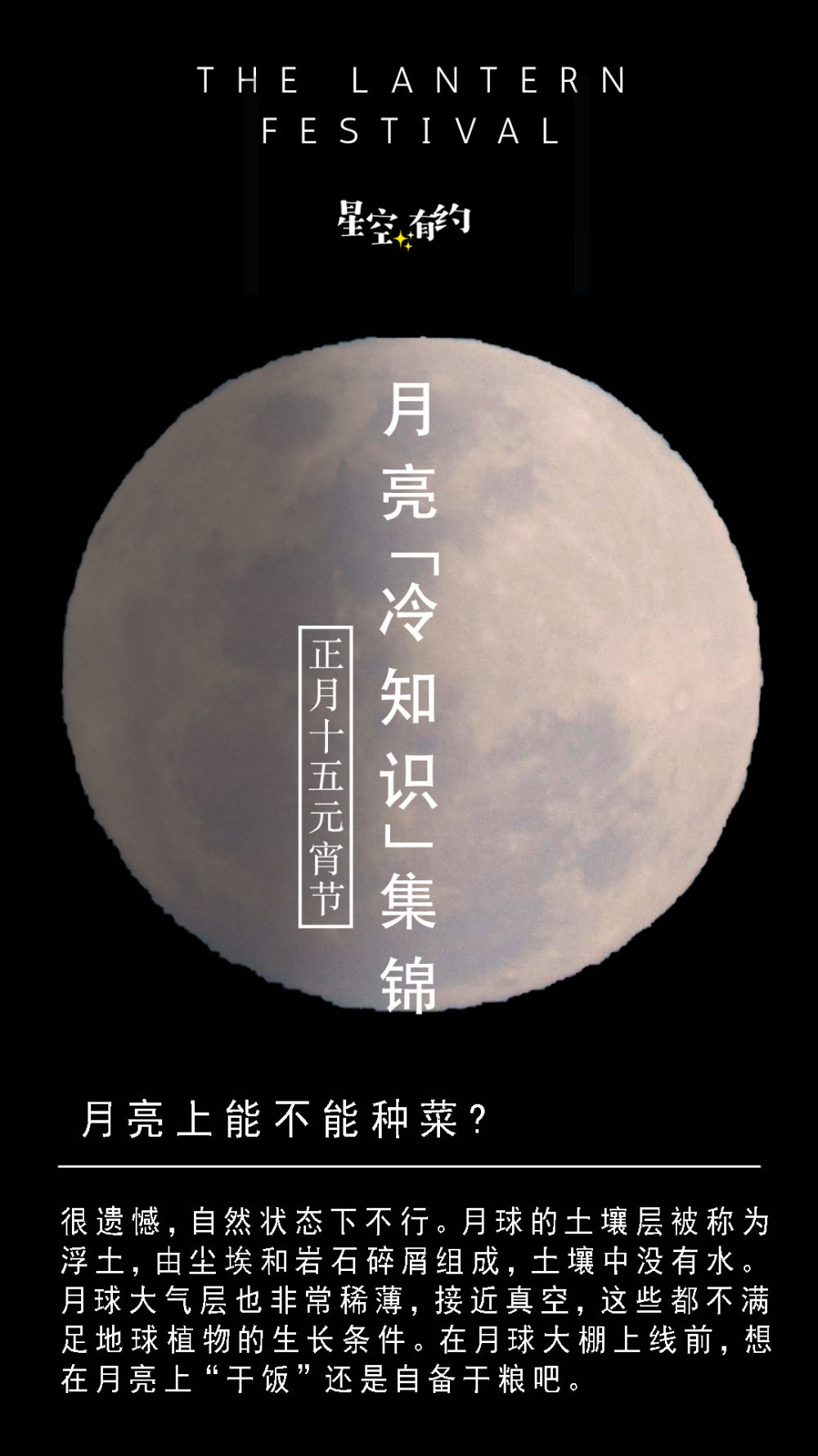 我知道你忍了好久,还想问:月亮上能不能种菜?很遗憾,自然状态下不行。月球的土壤层被称为浮土,由尘埃和岩石碎屑组成,土壤中没有水。月球大气层也非常稀薄,接近真空,这些都不满足地球植物的生长条件。在月球大棚上线前,想在月亮上“干饭”还是自备干粮吧。