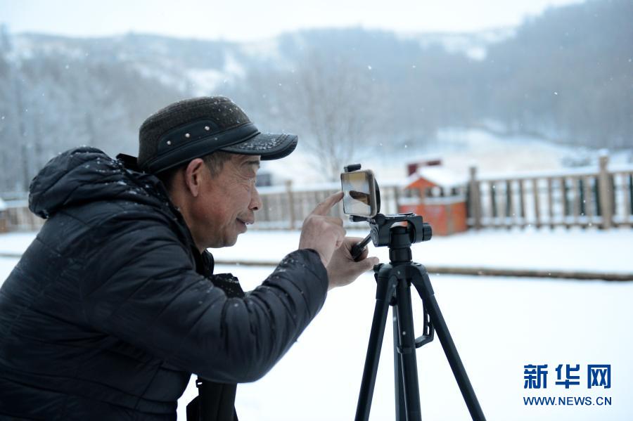 2月28日,在驼梁国家级自然保护区,巡护员戎喜民拍摄雪景。当天凌晨保护区迎来降雪。 新华社记者 金皓原 摄