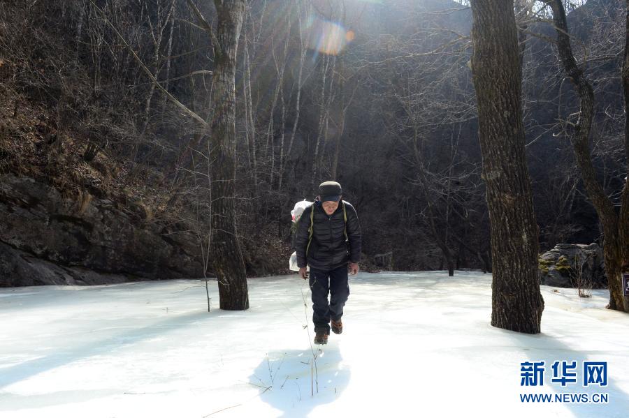 2月27日,在驼梁国家级自然保护区,巡护员戎喜民穿着防滑冰爪、背运生活物资在冰封路段行走。 新华社记者 金皓原 摄