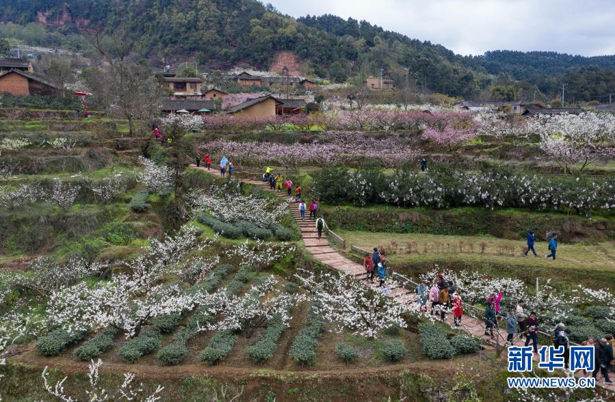 初春时节,四川省丹棱县顺龙乡幸福古村春意盎然,百花齐放,吸引各地游客前来踏青休闲。