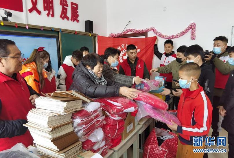 刘凤英和志愿者为一所乡村小学的孩子发放衣服和文具(3月4日摄)。新华社记者 张博宇 摄