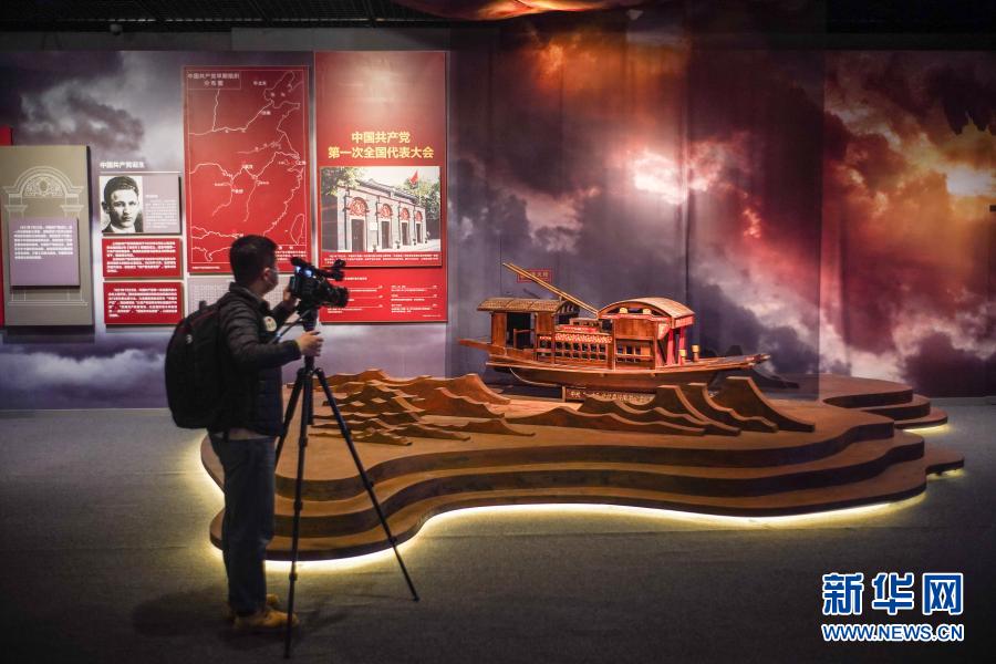 3月9日,一名记者在首都博物馆展厅内拍摄浙江嘉兴南湖红船模型。新华社记者 彭子洋 摄