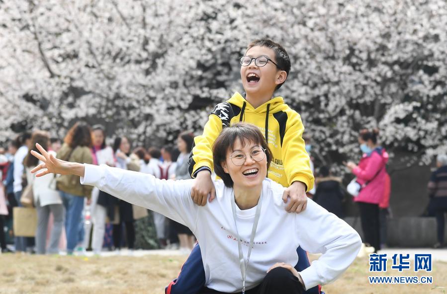 3月13日,广东援鄂医疗队成员梁仕凤带着孩子来到武汉大学赏樱游玩。新华社记者 程敏 摄