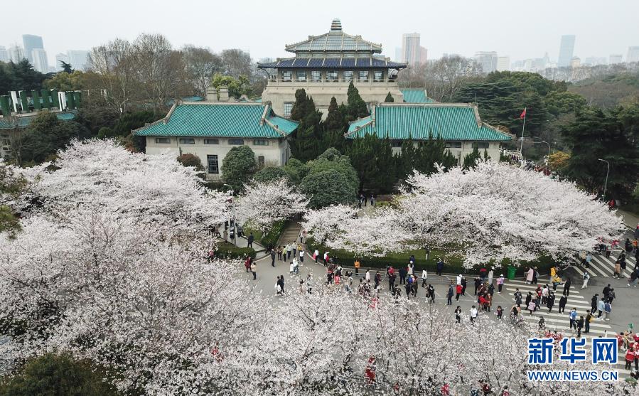 3月13日,来自各地的援鄂医护人员在武汉大学校园共赴樱花之约(无人机照片)。新华社记者 程敏 摄