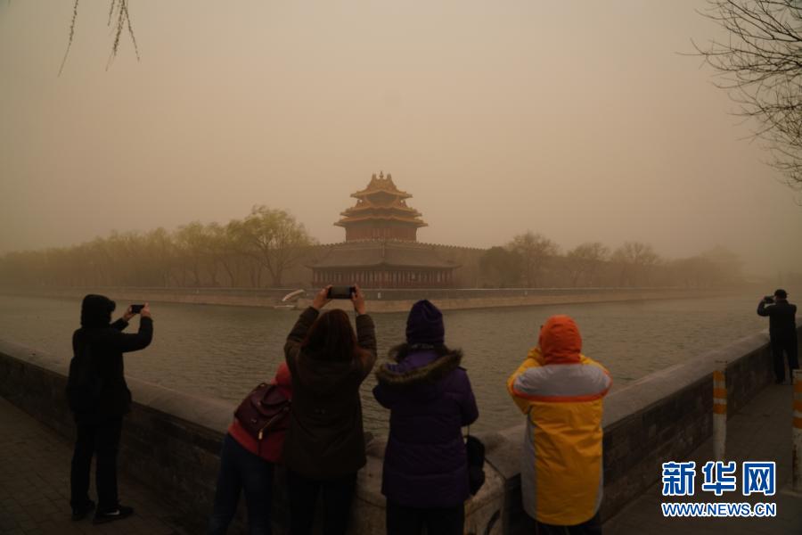 3月15日,人们在拍摄故宫角楼。当日,北京市遭遇沙尘天气。新华社记者 陈钟昊 摄