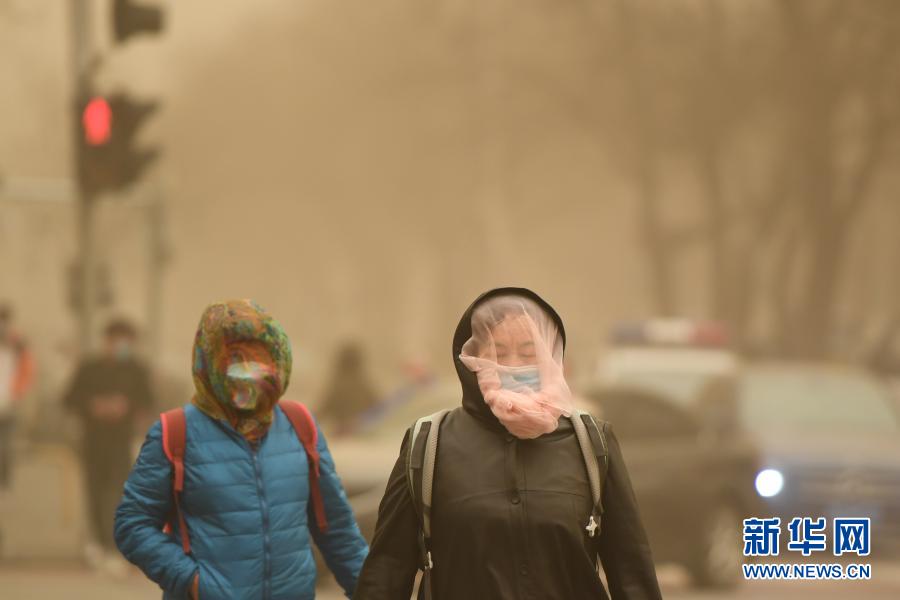 3月15日,在北京市东四环外朝阳路,行人脸上蒙着纱巾出行。当日,北京市遭遇沙尘天气。新华社记者 鞠焕宗 摄