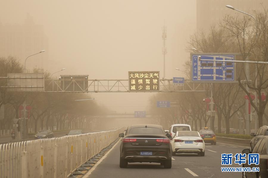 3月15日,在北京市丰台区,交通指示牌上显示着“大风沙尘天气 谨慎驾驶 减少出行”。当日,北京市遭遇沙尘天气。新华社记者 彭子洋 摄