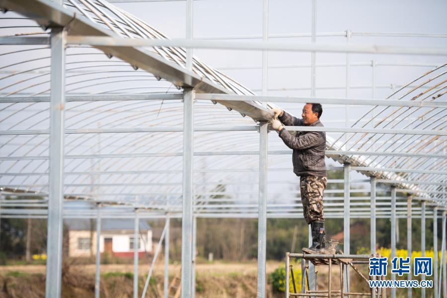 在湖南省岳阳市华容县万庾镇月形村,村民在搭建育秧大棚(3月3日摄)。新华社记者 陈思汗 摄
