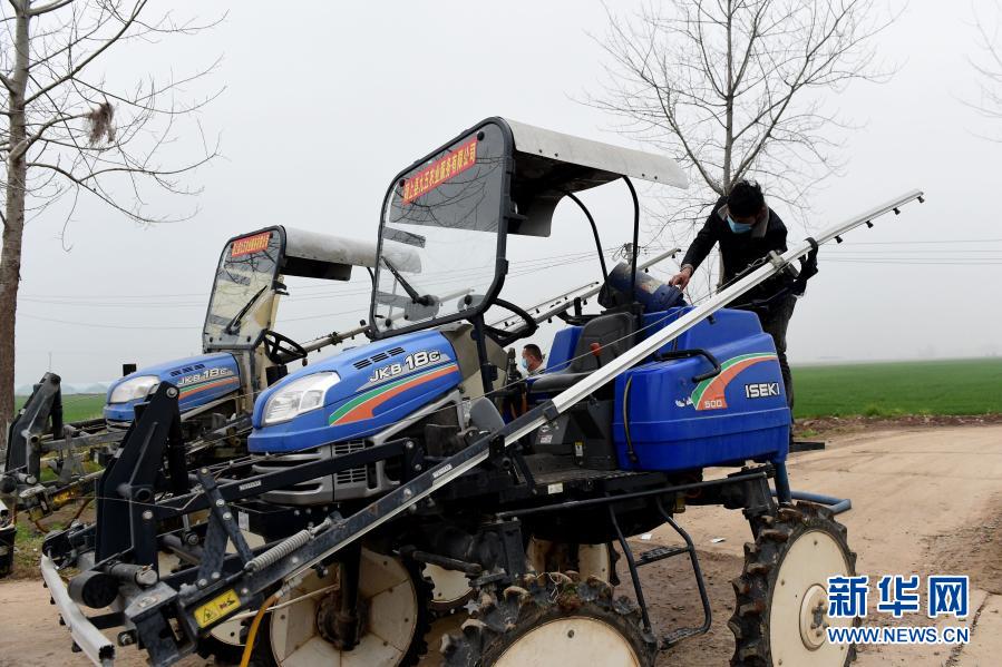 3月6日,安徽省颍上县王岗镇农民为农机添加农药。新华社记者 黄博涵 摄