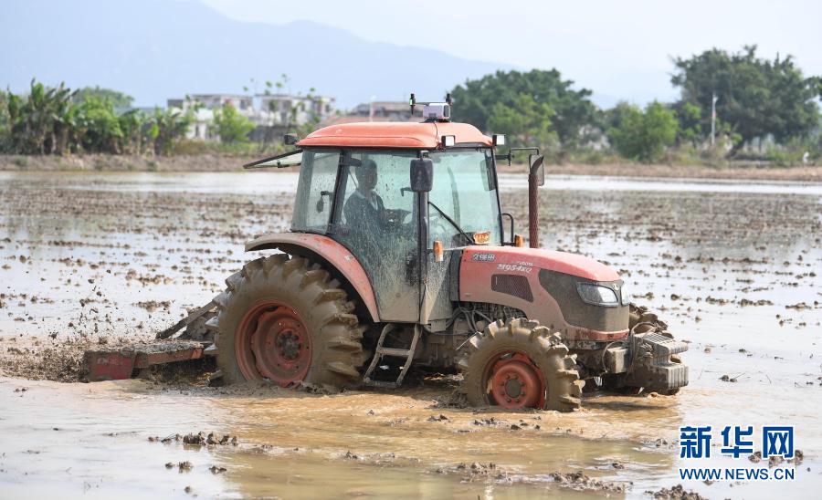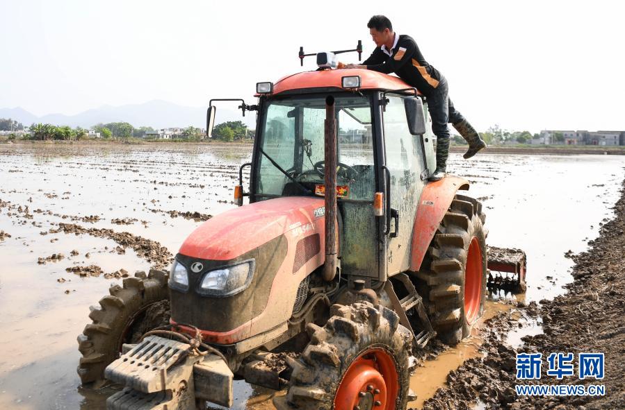 在广东台山市汶村镇茭一村,农民驾驶农机翻地作业(3月12日摄)。新华社记者 邓华 摄
