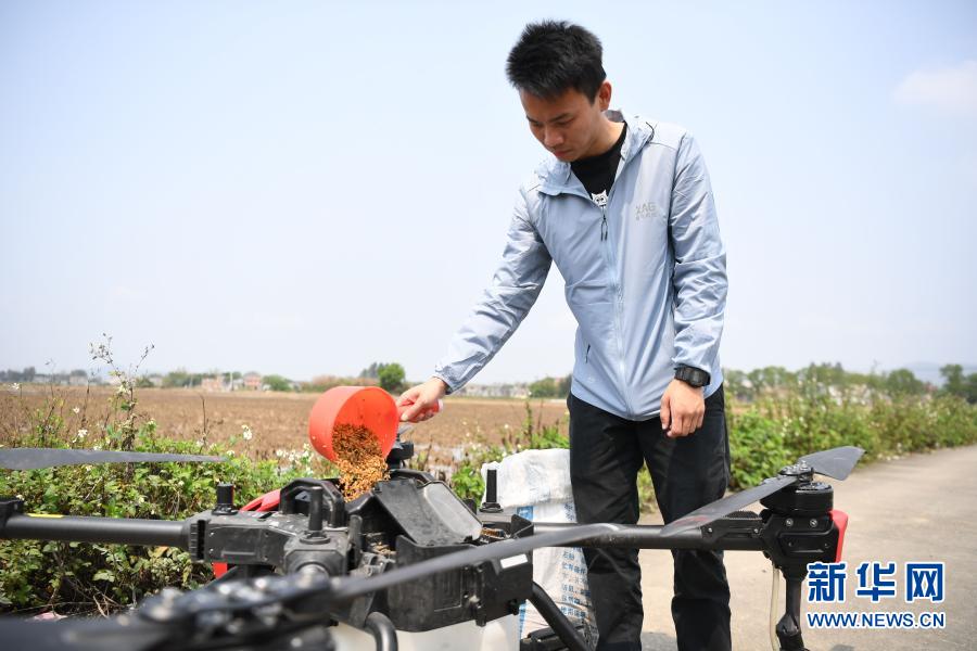 在广东台山市汶村镇茭一村,工作人员将水稻种子放入无人机(3月12日摄)。新华社记者 邓华 摄