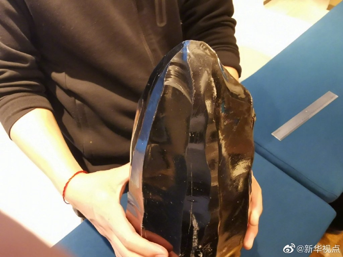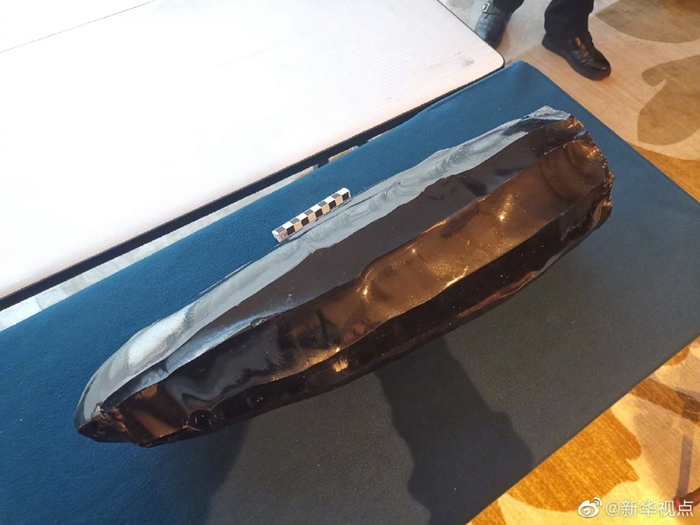 图为在和龙市发现的巨型黑曜岩石叶石核,对于研究旧石器时期,长白山一带人类打制石器的方法具有重要价值。