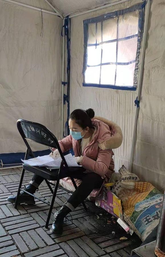 去年疫情期间,王丽娜在村口卡点值守。(受访者提供)