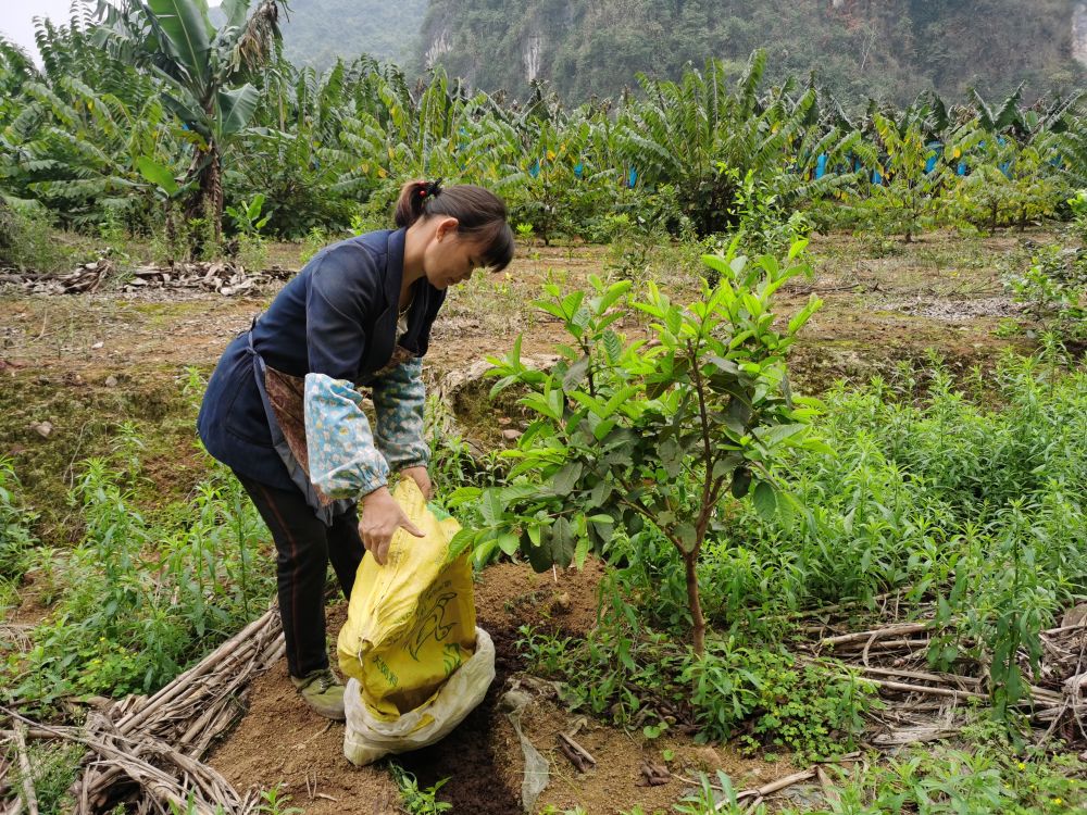 村民卢葵青在给番石榴施肥。(新华社记者王悦阳摄)