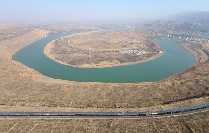 黄河流经宁夏中卫市沙坡头区(3月3日摄,无人机照片)。 新华社记者 唐如峰 摄