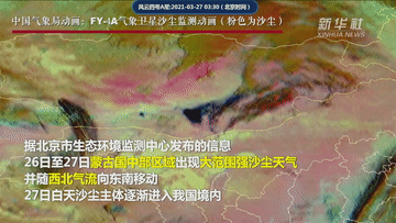 据北京市生态环境监测中心发布的信息,26日至27日蒙古国中部区域出现大范围强沙尘天气,并随西北气流向东南移动,27日白天沙尘主体逐渐进入我国境内,内蒙古、甘肃、山西、河北北部等地区先受到影响。