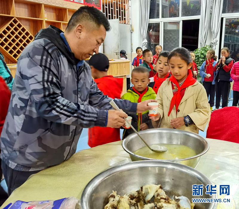 6点40分,孩子们奔向食堂。馒头、牛奶、鸡蛋开启一天的能量摄入。满头大汗的足球队员在一口大盆前排起了队。“校队体力消耗大,这是给他们熬的牦牛骨头汤。”格桑给拿着纸杯的孩子每人盛了一勺。