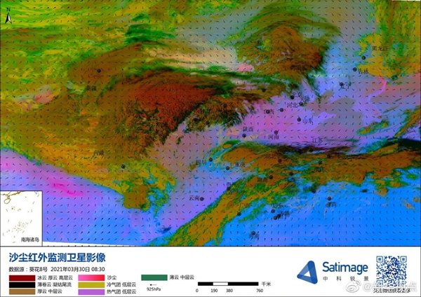 据上海市生态环境局发布,受海上沙尘输送影响,上海30日出现PM10污染过程,短时达到严重污染。分析认为,海上沙尘之所以来势汹汹,一方面是由于29日夜间至30日上午,降水明显较此前预报偏弱;另一方面是由于海上沙尘气团范围不明。预计30日夜间主导偏东风,伴有降水,沙尘影响将逐渐缓解。(记者 王默玲)(图片由上海市生态环境局提供)