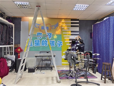 与普通乐团不同,爱特乐团全由大龄自闭症“孩子”组成。3月31日,乐团策划了一场直播,最新打印的标语“你好,星星的孩子!”刚被挂起。家长们买来了印有星星的深蓝色窗帘布遮住乐器架子,又专门挑了星星形状的小灯挂在墙上。