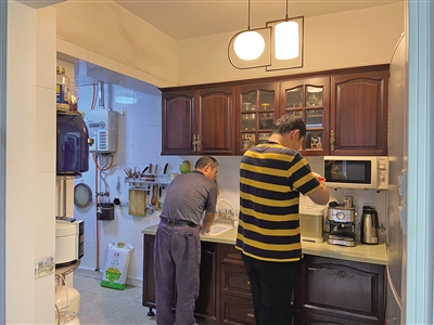 3月28日,吃完饭后,寿虹拉来贝贝擦碗。这是训练贝贝自主性的环节之一。新京报记者 李雨凝 摄