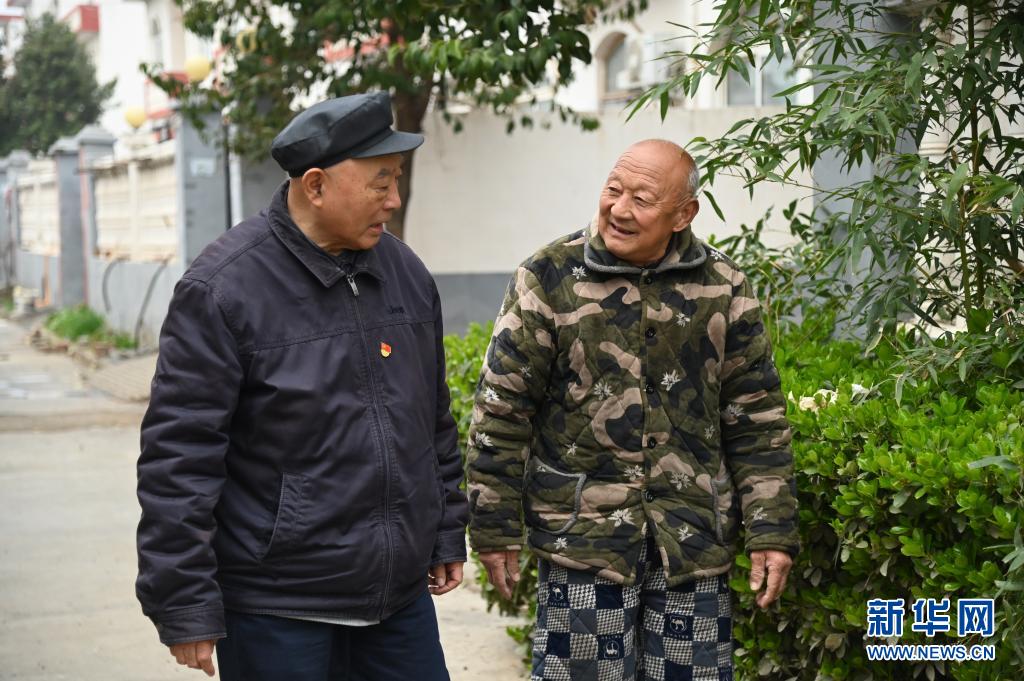 3月11日,吴金印(左)与唐庄镇四和社区居民交流。新华社记者 张浩然 摄