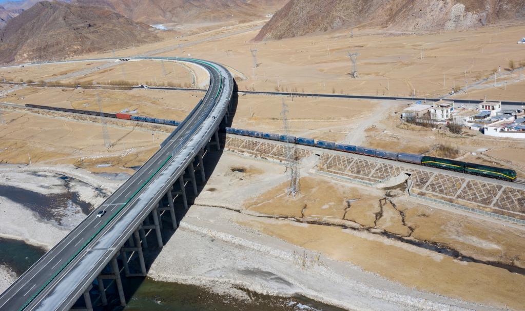 这是拉萨至那曲高等级公路和青藏铁路沿线风光。(无人机照片,新华社记者普布扎西1月28日摄)