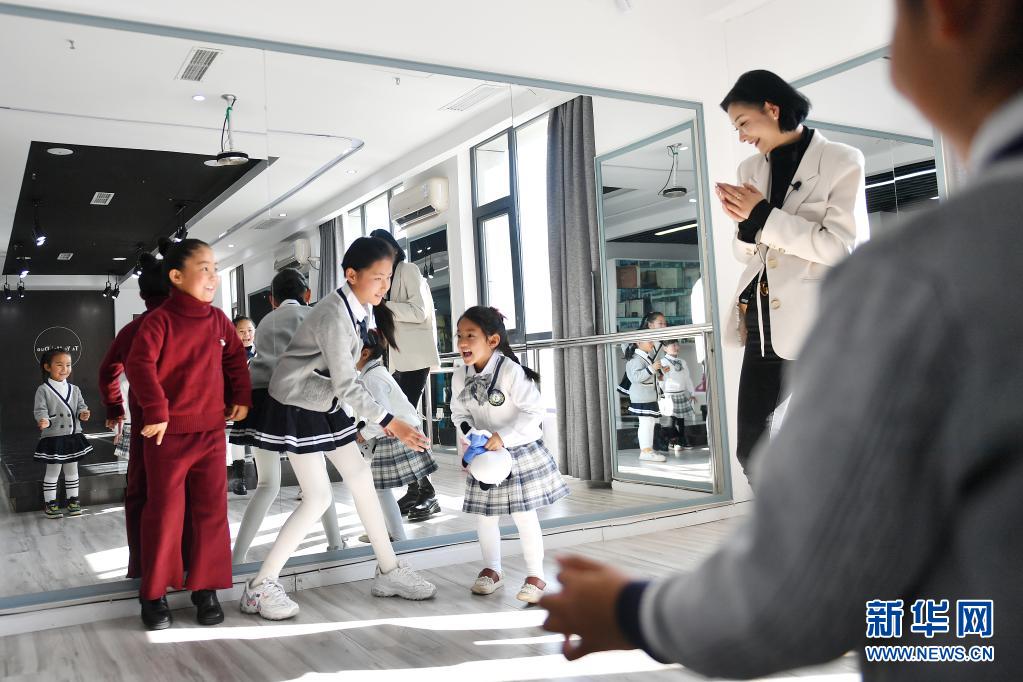 洛桑卓玛(右后)和参加少儿模特培训的学生们一起做游戏(3月13日摄)。新华社记者 孙瑞博 摄