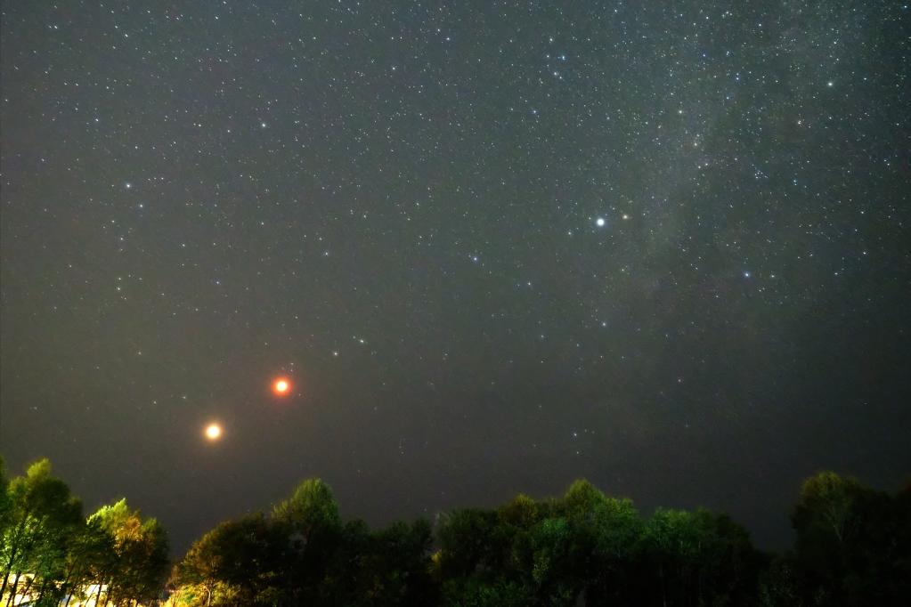 北京市天文爱好者王俊峰2018年7月在青海省都兰县拍摄的月全食时“红月亮”与火星大冲时“红火星”在天宇近距离争辉的照片。