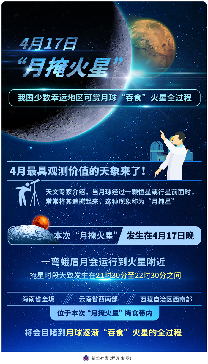 新华社天津4月15日电(记者周润健)4月最具观测价值的天象来了!天文专家介绍,17日“月掩火星”奇特天象将现身天宇。届时如果天气晴好,我国海南省全境、云南省西南部、西藏自治区西南部将会非常幸运地看到火星被月球完全遮住的全过程,而其他地区因地理位置等原因,只能看到火星与月亮的近距离接触。