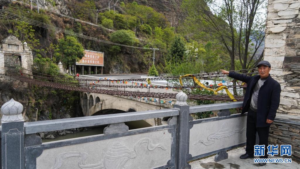 在四川小金县,杨华富向记者讲述守护猛固桥的经历(4月14日摄)。新华社记者 王曦 摄