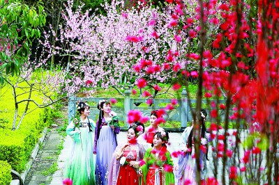 湖北襄阳黄家湾景区,汉服爱好者踏青赏花。新华社发