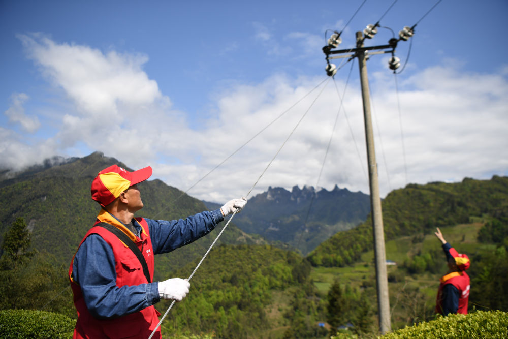 4月15日,壶瓶山供电所的工人们在湖南省常德市石门县壶瓶山镇管山村巡线。新华社记者 薛宇舸 摄