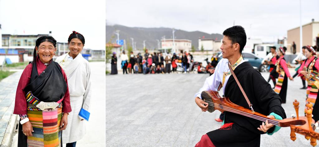 拼版照片:左图为西藏日喀则市拉孜县查务乡明玛村村民仓琼(左)和儿子群培次仁;右图为拉孜县民间艺术团在明玛村易地搬迁点为村民表演(2020年8月2日摄)。新华社记者 詹彦 摄