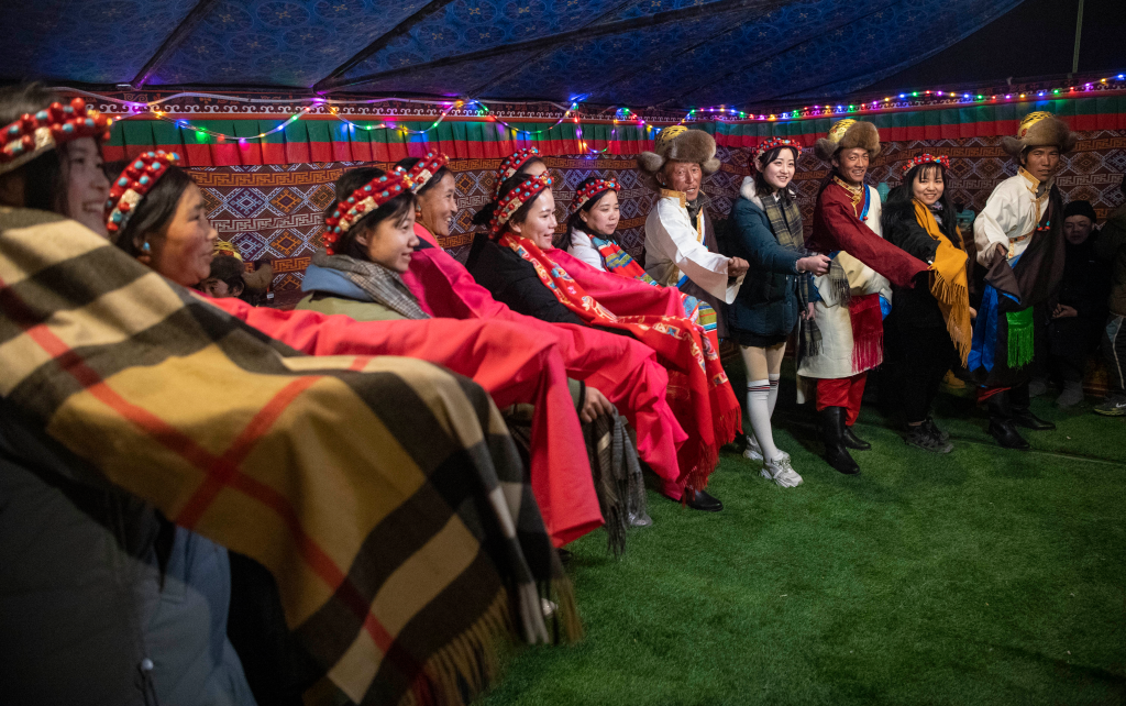 西藏日喀则市扎西宗乡巴松村发展旅游产业,当地农牧民和游客一起跳起民族舞蹈(2020年1月20日摄)。新华社记者 孙非 摄