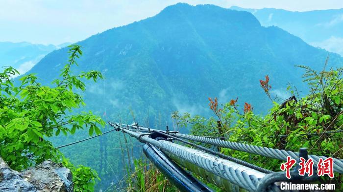 “龙池飞线”由两根钢丝绳和一根水管组成,两头“系”在大布滩河两岸的悬崖上。 周星亮 摄