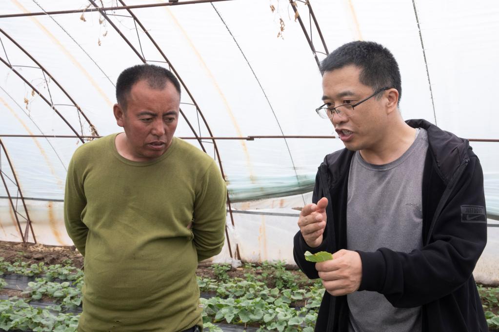 4月22日,黑龙江八一农垦大学教授靳亚忠(右)在为瓜农邢宝军查看瓜秧病情。新华社记者张涛摄