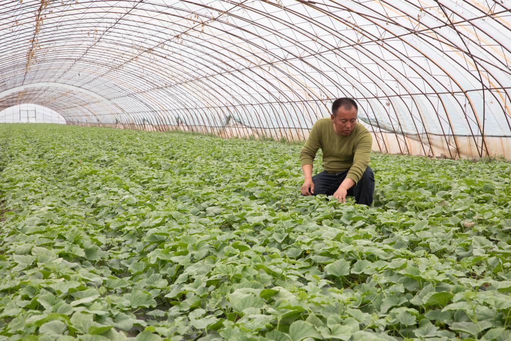4月22日,瓜农邢宝军在自家大棚里查看秧苗状态。新华社记者张涛摄
