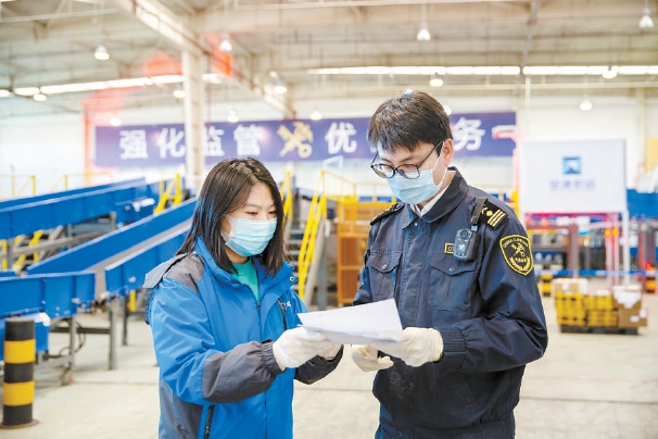 北京海关所属首都机场海关关员在监管现场为跨境电商企业人员提供政策咨询和通关业务指导。